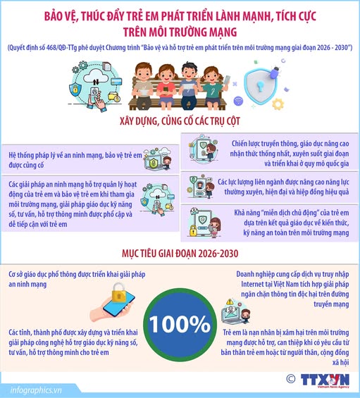 Thủ tướng Chính phủ Phạm Minh Chính ký Quyết định số 468/QĐ-TTg phê duyệt Chương trình “Bảo vệ và hỗ trợ trẻ em phát triển trên môi trường mạng giai đoạn 2026 - 2030” (Chương trình). Chương trình nhằm thực hiện “mục tiêu kép” là tăng cường bảo vệ trẻ em và hỗ trợ, thúc đẩy trẻ em phát triển lành mạnh, tích cực, nâng cao năng lực số trong bối cảnh chuyển đổi số quốc gia, hướng tới góp phần hình thành thế hệ “công dân số” của Việt Nam trong tình hình mới. Chuyển dịch cơ bản hoạt động bảo vệ trẻ em trên môi trường mạng trở thành mô hình phòng ngừa, ngăn chặn chủ động các mối nguy hại đối với trẻ em trên môi trường mạng.
