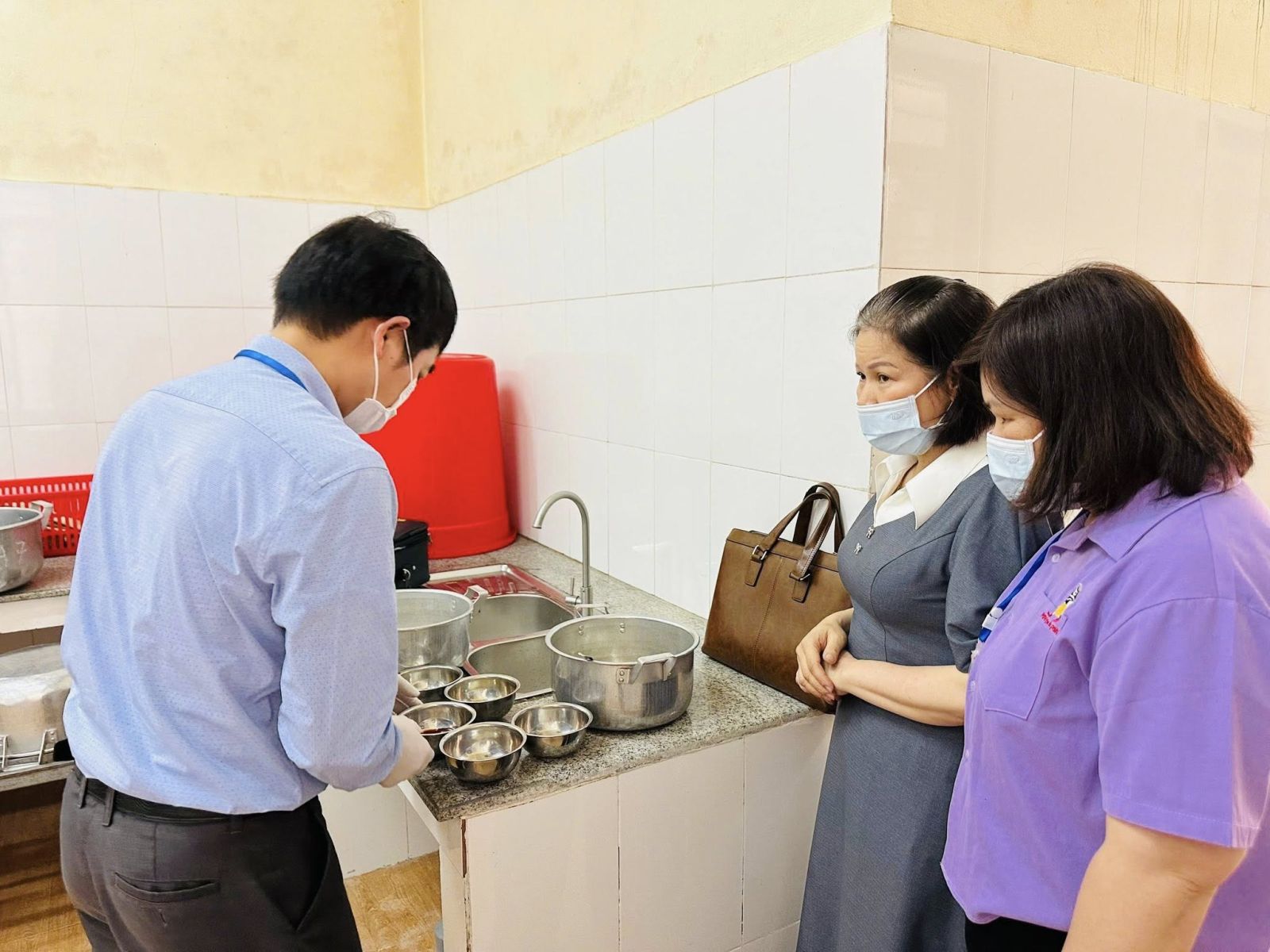 Đặc biệt, công tác kiểm thực 3 bước và lưu mẫu thức ăn được thực hiện nghiêm túc, đúng quy định. Kết quả test nhanh đánh giá độ sạch dụng cụ bằng dung dịch Lugol cho thấy đạt yêu cầu.