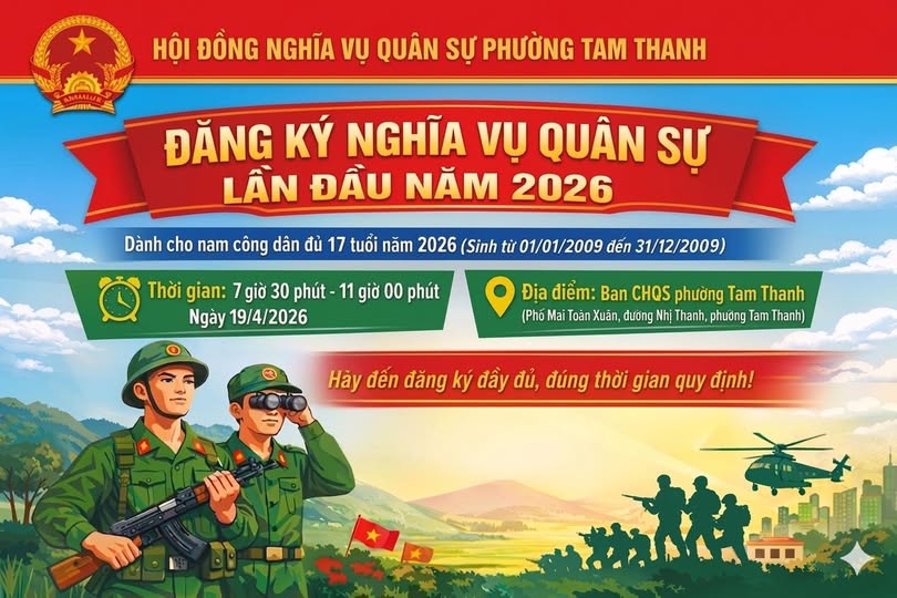 Thực hiện Luật Nghĩa vụ quân sự, Hội đồng Nghĩa vụ quân sự phường Tam Thanh thông báo tổ chức đăng ký nghĩa vụ quân sự lần đầu năm 2026 như sau: