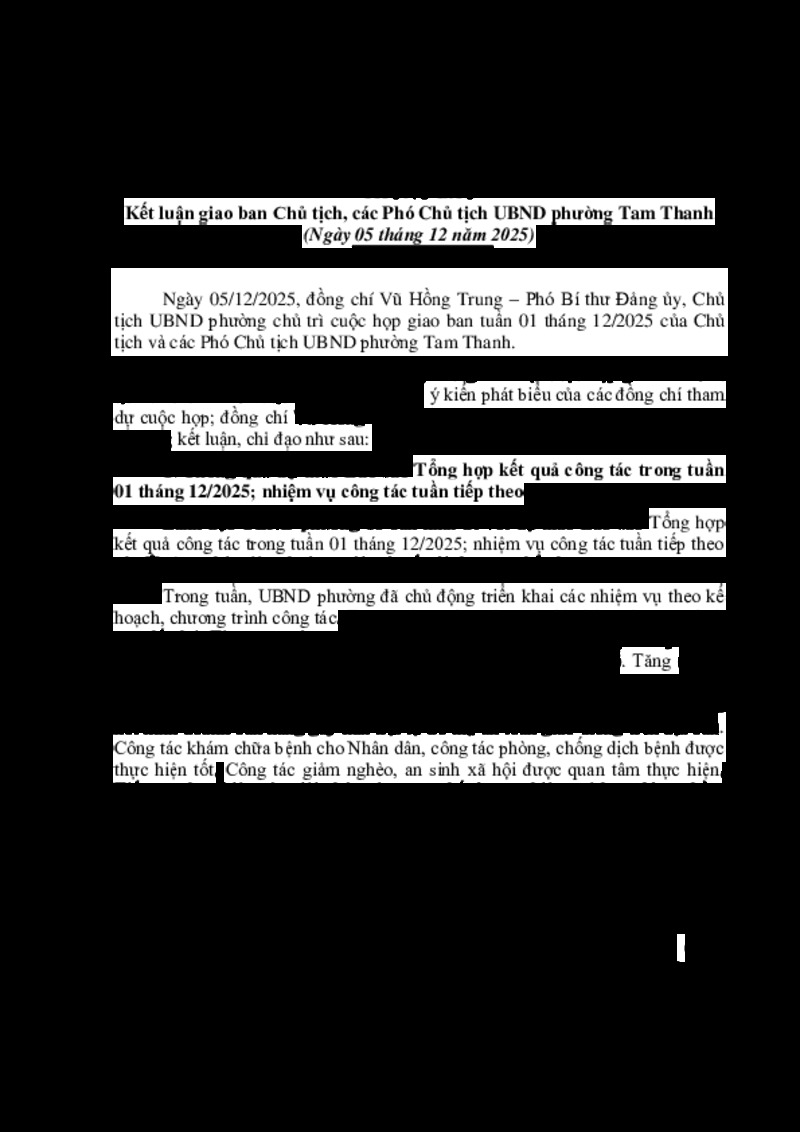 | Tiêu đề văn bản | THÔNG BÁO Kết luận giao ban Chủ tịch, các Phó Chủ tịch UBND phường Tam Thanh (Ngày 05 tháng 12 năm 2025) | ||