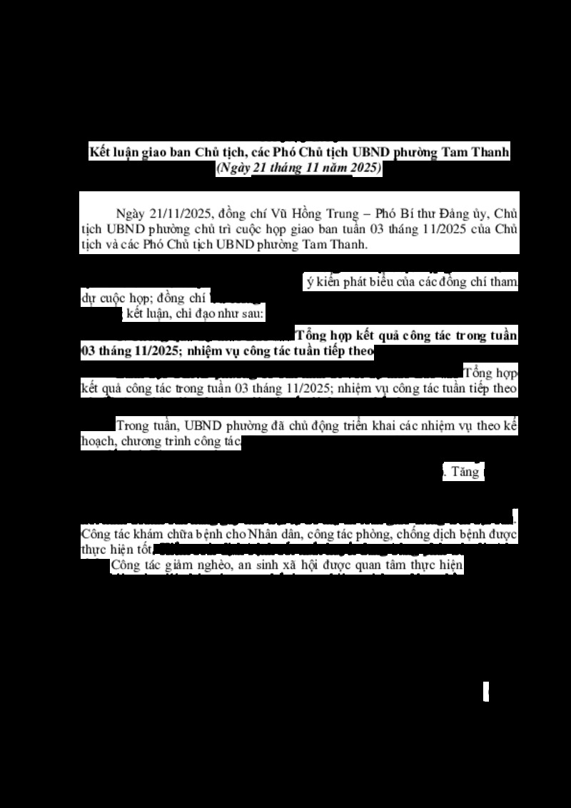 | Tiêu đề văn bản | THÔNG BÁO Kết luận giao ban Chủ tịch, các Phó Chủ tịch UBND phường Tam Thanh (Ngày 21 tháng 11 năm 2025) | ||