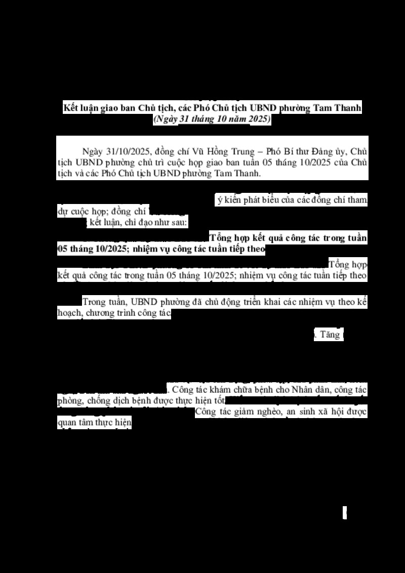 | Tiêu đề văn bản | THÔNG BÁO Kết luận giao ban Chủ tịch, các Phó Chủ tịch UBND phường Tam Thanh (Ngày 31 tháng 10 năm 2025) | ||