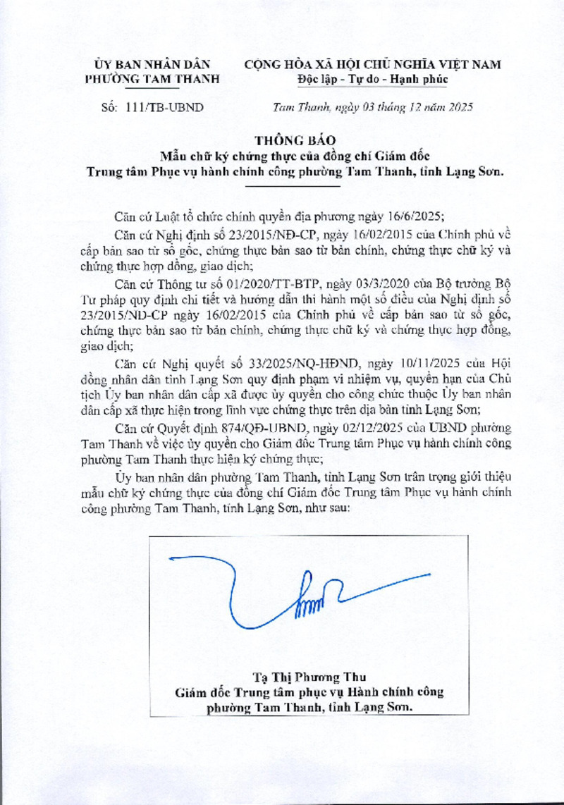 | Tiêu đề văn bản | Thông báo mẫu chữ ký chứng thực của đồng chí Giám đốc Trung tâm, phục vụ hành chính công phường Tam Thanh | ||
