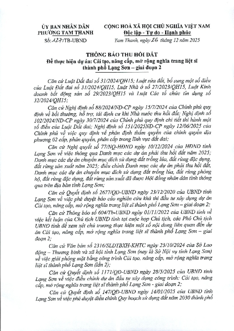 | Tiêu đề văn bản | Thông báo thu hồi đất để thực hiện dự án cải tạo, nâng cấp, mở rộng nghĩa trang liệt sỹ thành phố Lạng Sơn giai đoạn 2 | ||