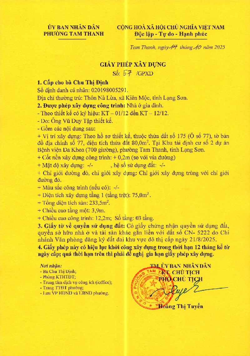 | Tiêu đề văn bản | Giấy phép xây dựng bà Chu Thị Định | ||
