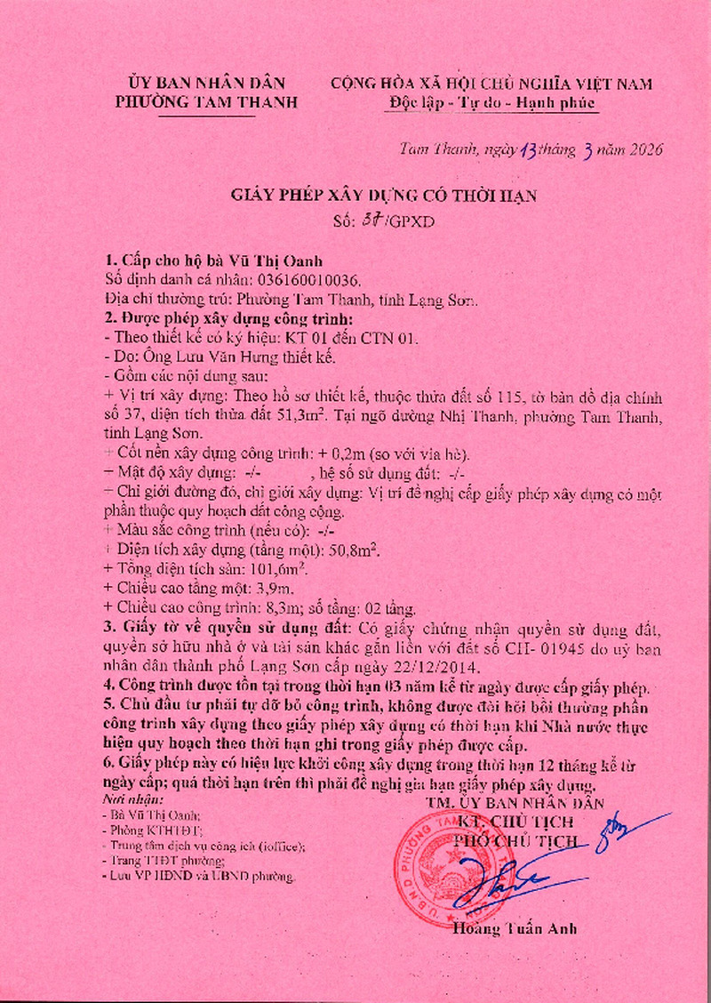 | Tiêu đề văn bản | Giấy phép xây dựng cấp bà Vũ Thị Oanh phường Tam Thanh, tỉnh Lạng Sơn. Đất tại N Ngõ Nhị Thanh, phường Tam Thanh, tỉnh Lạng Sơn | ||