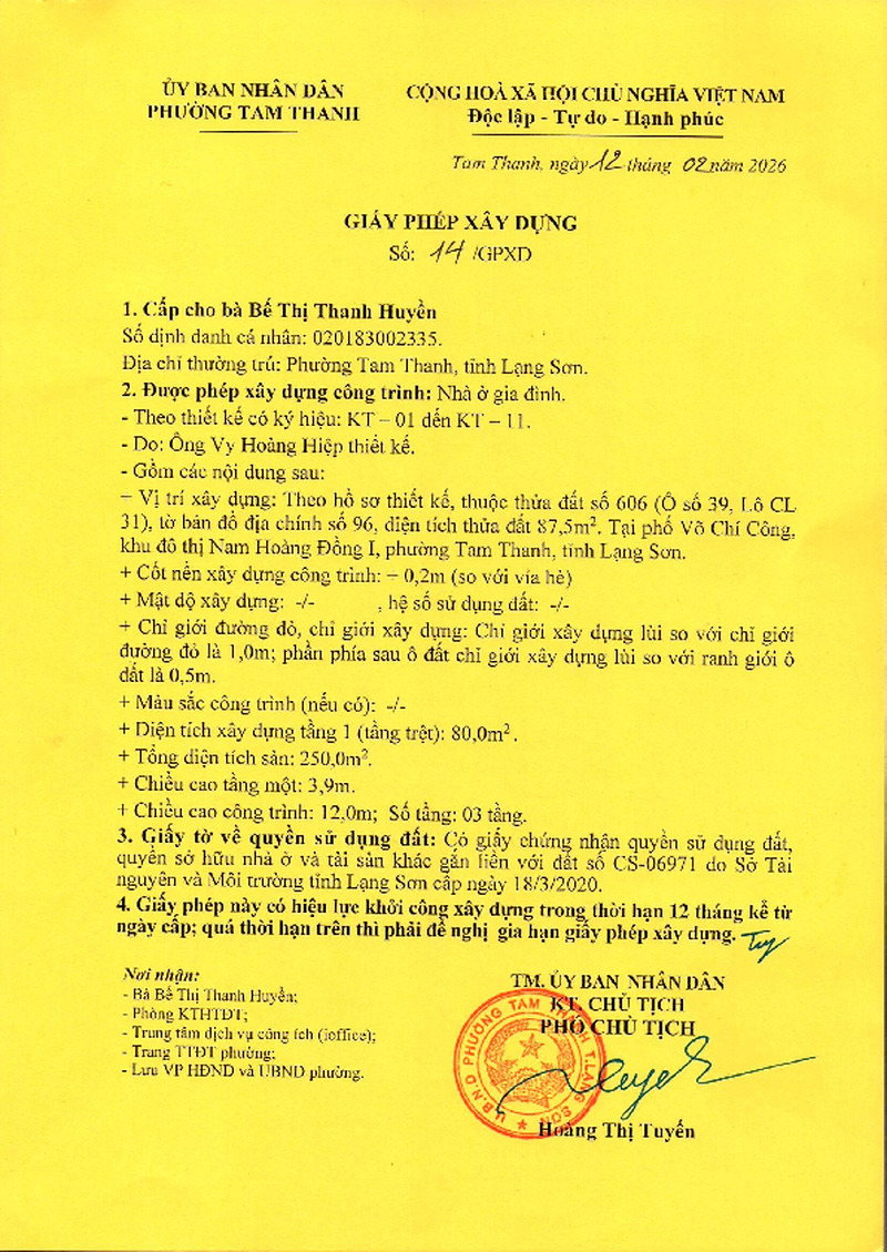 | Tiêu đề văn bản | Giấy phép xây dựng cấp cho bà Bế Thị Thanh Huyền, phường Tam Thanh, tỉnh Lạng Sơn. Đất tại Phố Võ Chí Công, Khu đô thị Nam Hoàng Đồng I, phường Tam Thanh, Tỉnh Lạng Sơn | ||