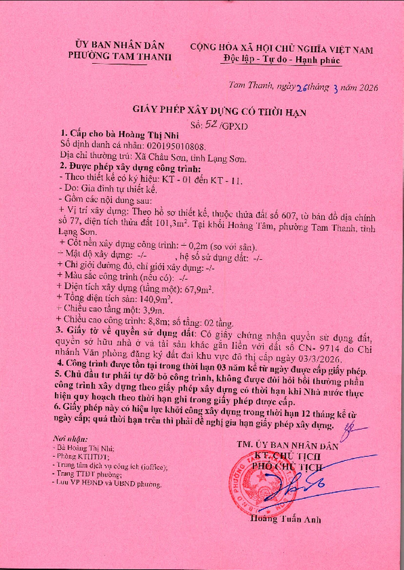 | Tiêu đề văn bản | Giấy phép xây dựng cấp cho hộ bà Hoàng Thị Nhị, xã Châu Sơn, tỉnh Lạng Sơn. Đất tại đường Trần Đăng Ninh, khối Hoàng Trung, phường Tam Thanh, tỉnh Lạng Sơn | ||