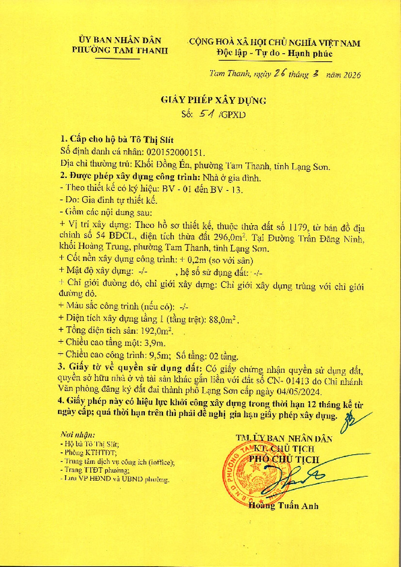 | Tiêu đề văn bản | Giấy phép xây dựng cấp cho hộ bà Tô thị Slít, khối Đồng Én, phường Tam Thanh, tỉnh Lạng Sơn. Đất tại đường Trần Đăng Ninh, khối Hoàng Trung, phường Tam Thanh, tỉnh Lạng Sơn | ||