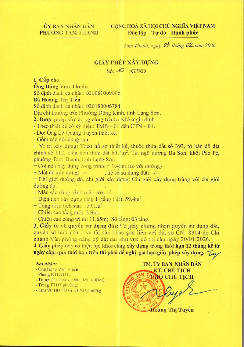| Tiêu đề văn bản | Giấy phép xây dựng cấp cho ông Đặng Văn Thuần, bà Hoàng Thị Tiến phường Đông Kinh, tỉnh Lạng Sơn. Đất tại Ngõ đường Ba Sơn, Khối Pàn Pè, phường Tam Thanh, Tỉnh Lạng Sơn | ||