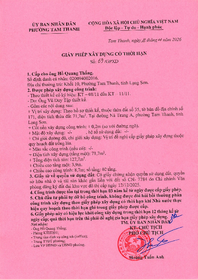 | Tiêu đề văn bản | Giấy phép xây dựng cấp cho ông Hồ Quang Thắng, Khối 10, phường Tam Thanh, tỉnh Lạng Sơn. Đất tại đường Nà Trang A, phường Tam Thanh, tỉnh Lạng Sơn | ||