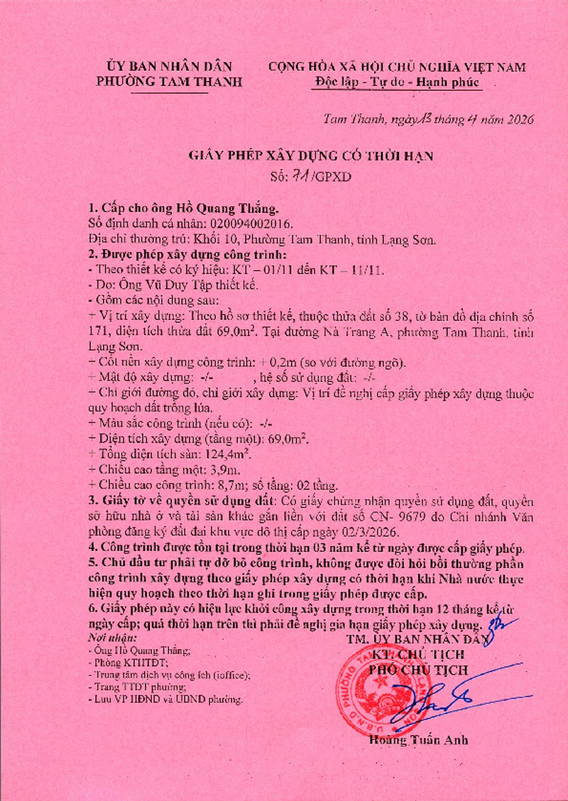 | Tiêu đề văn bản | Giấy phép xây dựng cấp cho ông Hồ Quang Thắng, Khối 10, phường Tam Thanh, tỉnh Lạng Sơn. Đất tại đường Nà Trang A, phường Tam Thanh, tỉnh Lạng Sơn (Thửa 3) | ||