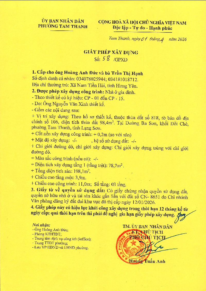 | Tiêu đề văn bản | Giấy phép xây dựng cấp cho ông Hoàng Anh Đức, bà Trần Thị Hạnh, xã Nam Tiền hải, tỉnh Hưng Yên. Đất tại đường Ba Sơn, Khối Đồi Chè, phường Tam Thanh, tỉnh Lạng Sơn | ||