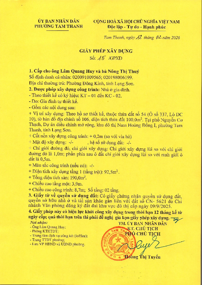 | Tiêu đề văn bản | Giấy phép xây dựng cấp cho ông Lâm Quang Huy, bà Nông Thị Thúy, phường Đông Kinh, tỉnh Lạng Sơn. Đất tại Phố Nguyễn Cơ Thạch, dự án điều chỉnh mở rộng, Khu đô thị Nam Hoàng Đồng I, phường Tam Thanh, Tỉnh Lạng Sơn | ||
