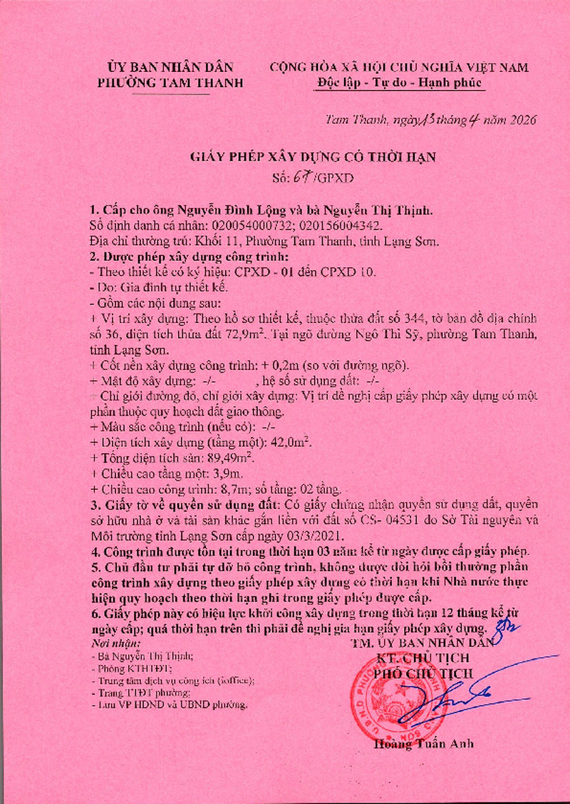 | Tiêu đề văn bản | Giấy phép xây dựng cấp cho ông Nguyễn Đình Lộng, bà Nguyễn Thị Thịnh, Khối 11, phường Tam Thanh, tỉnh Lạng Sơn. Đất tại ngõ đường Ngô Thì Sỹ, phường Tam Thanh, tỉnh Lạng Sơn | ||