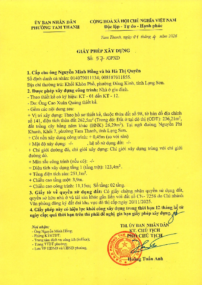 | Tiêu đề văn bản | Giấy phép xây dựng cấp cho ông Nguyễn Minh Hồng, bà Hà Thị Quyên Khòn Phổ, phường Đông Kinh tỉnh Lạng Sơn. Đất tại đường Nguyễn Phi Khanh, Khối 7, phường Tam Thanh, tỉnh Lạng Sơn | ||