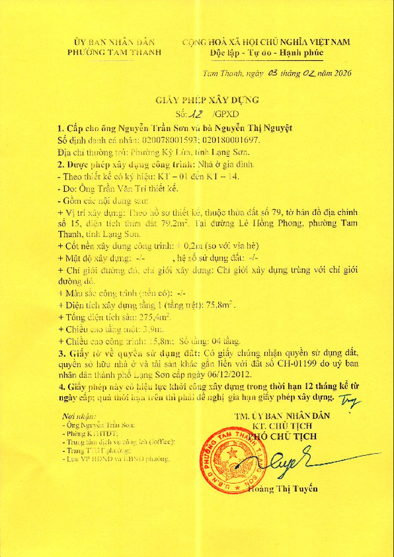 | Tiêu đề văn bản | Giấy phép xây dựng cấp cho ông Nguyễn Trần Sơn, bà Nguyễn Thị Nguyệt, phường Kỳ Lừa, tỉnh Lạng Sơn. Đất tại đường Lê Hồng Phong, phường Tam Thanh, Tỉnh Lạng Sơn | ||