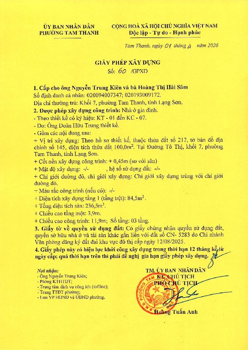 | Tiêu đề văn bản | Giấy phép xây dựng cấp cho ông Nguyễn Trung Kiên, bà Hoàng Thị Hải Sâm, Khối 7, phường Tam Thanh. Đất tại đường Tô Thị Khối 7, phường Tam Thanh, tỉnh Lạng Sơn | ||