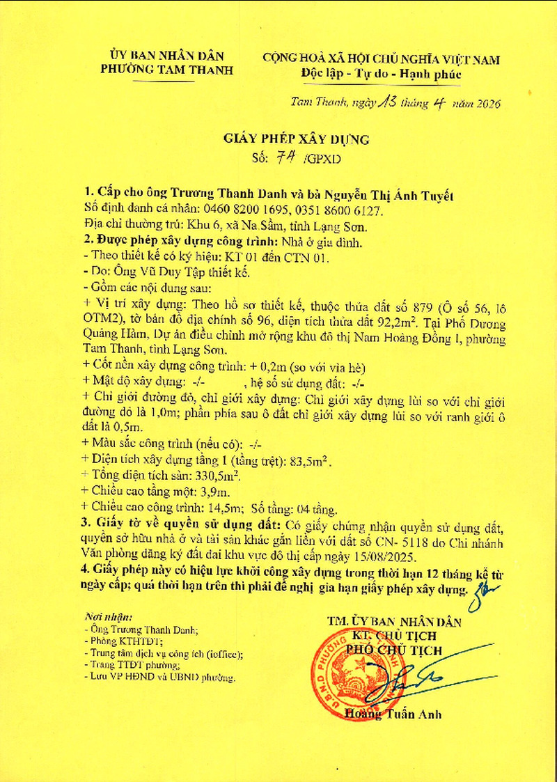 | Tiêu đề văn bản | Giấy phép xây dựng cấp cho ông Trương Thanh Danh, bà Nguyễn Thị Ánh Tuyết, Khối 6, xã Na Sầm, tỉnh Lạng Sơn. Đất tại phố Dương Quảng Hàm, Dự án điều chỉnh mở rộng khu đô thị Nam Hoàng Đồng I, phường Tam Thanh, tỉnh Lạng Sơn | ||