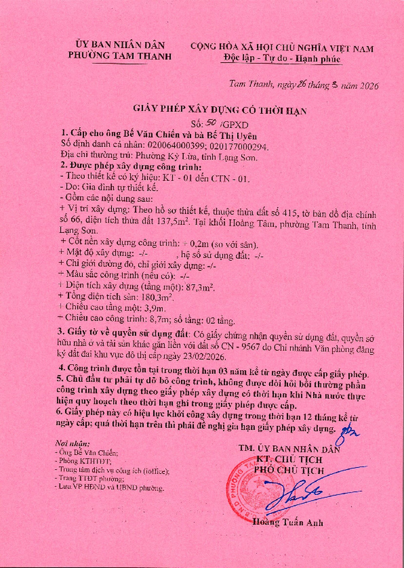| Tiêu đề văn bản | Giấy phép xây dựng cấp ông Bế Văn Chiến, bà Bế Thị Uyên, Phường Kỳ Lừa, phường Tam Thanh, tỉnh Lạng Sơn. Đất tại khối Hoàng Tâm, phường Tam Thanh, tỉnh Lạng Sơn | ||