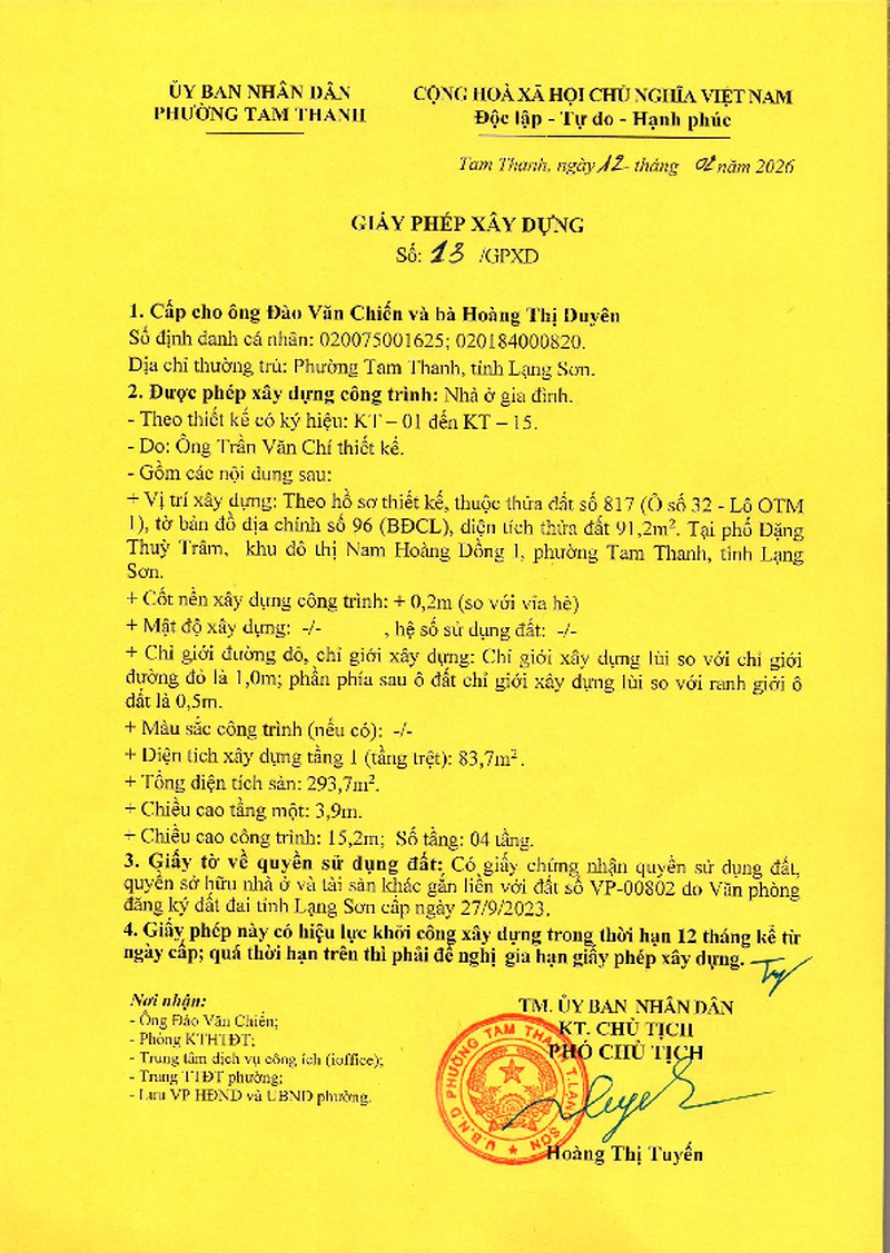 | Tiêu đề văn bản | Giấy phép xây dựng cấp ông Đào Văn Chiến, bà Hoàng Thị Duyên phường Tam Thanh, tỉnh Lạng Sơn. Đất tại Phố Đặng Thùy Trâm, khu đô thị Nam Hoàng Đồng I, phường Tam Thanh, Tỉnh Lạng Sơn | ||