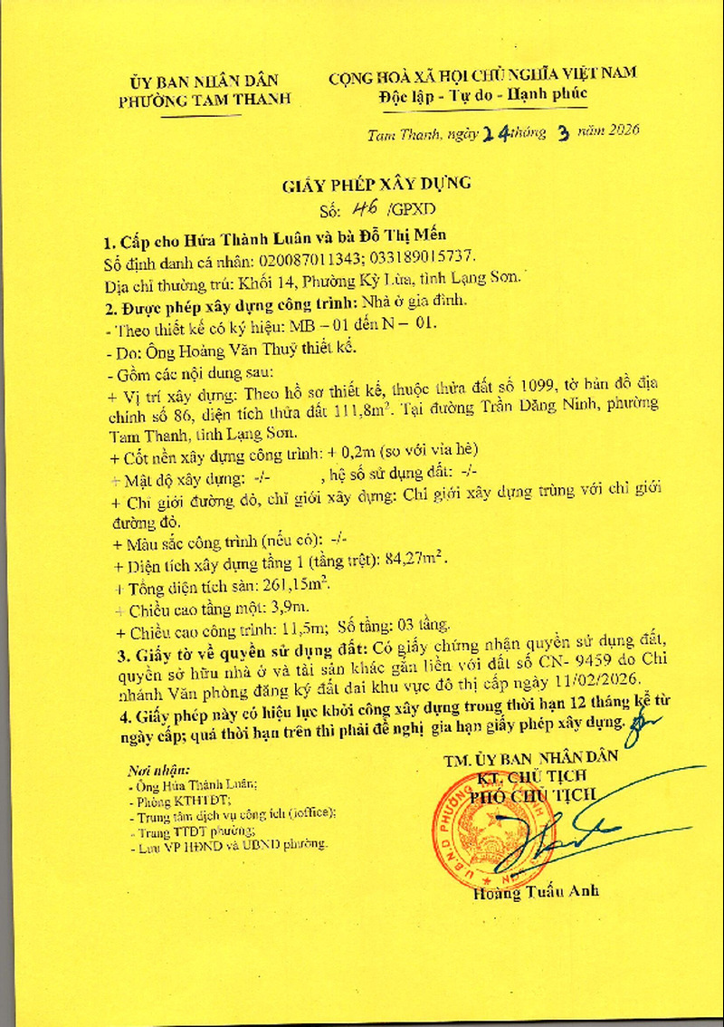 | Tiêu đề văn bản | Giấy phép xây dựng cấp ông Đỗ Thành Luân, Đỗ Thị Mến, khối 14, phường Kỳ Lừa, tỉnh Lạng Sơn. Đất đường Trần Đăng Ninh, phường Tam Thanh, tỉnh Lạng Sơn | ||