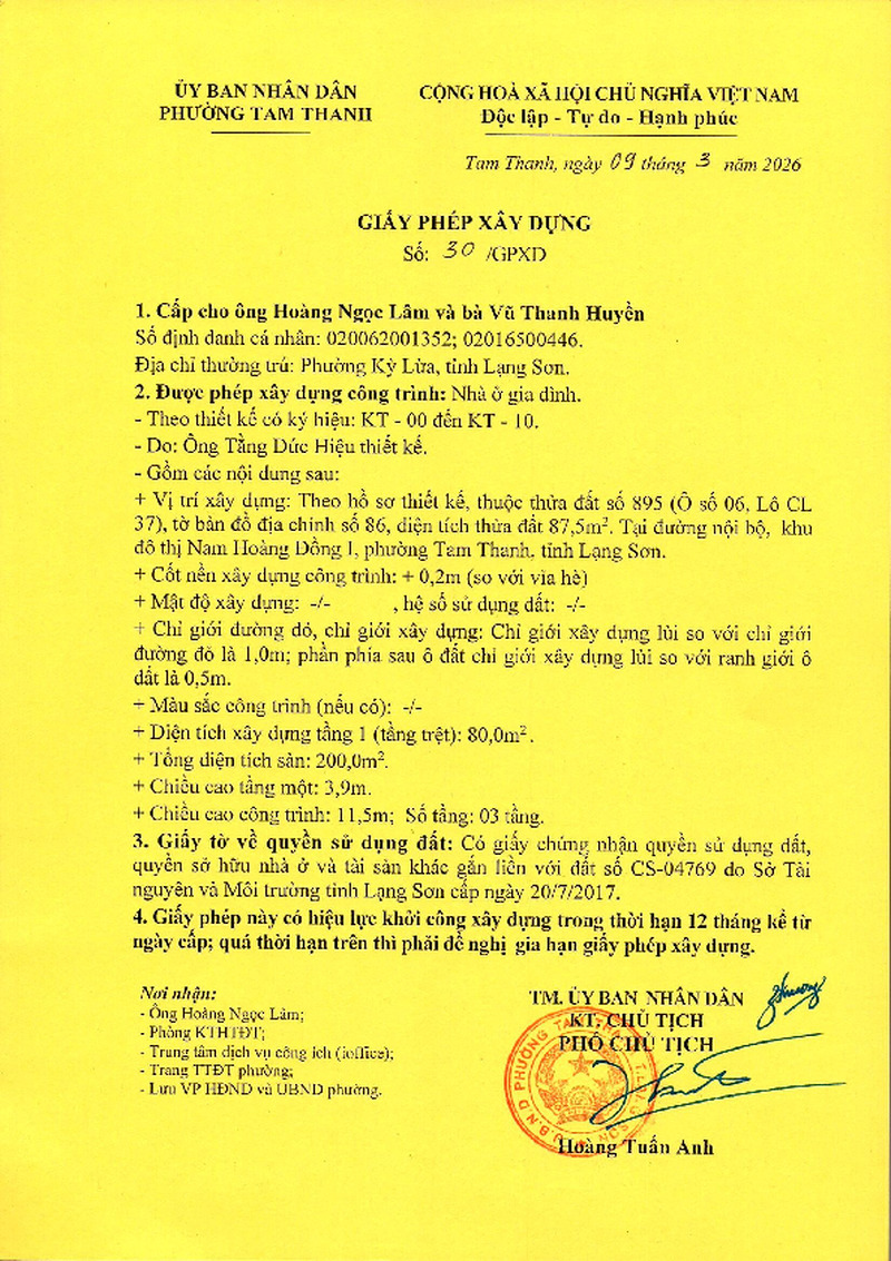 | Tiêu đề văn bản | Giấy phép xây dựng cấp ông Hoàng Ngọc Lâm, bà Vũ Thanh Huyền, phường Kỳ Lừa, tỉnh Lạng Sơn. Đất tại đường nội bộ, Khu đô thị Nam Hoàng Đồng I, phường Tam Thanh, tỉnh Lạng Sơn | ||