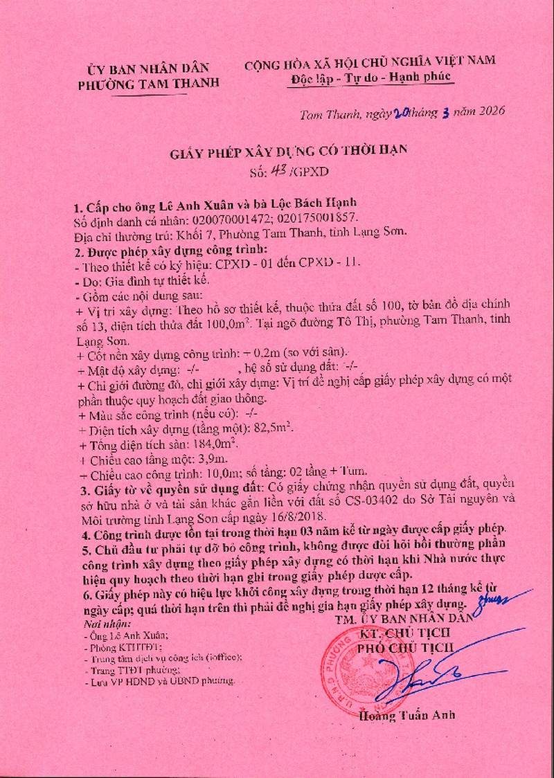 | Tiêu đề văn bản | Giấy phép xây dựng cấp ông Lê Anh Xuân, bà Lộc Bách Hạnh, khối 7, phường Tam Thanh. Đất tại đường ngõ Tô Thị, phường Tam Thanh, tỉnh Lạng Sơn | ||