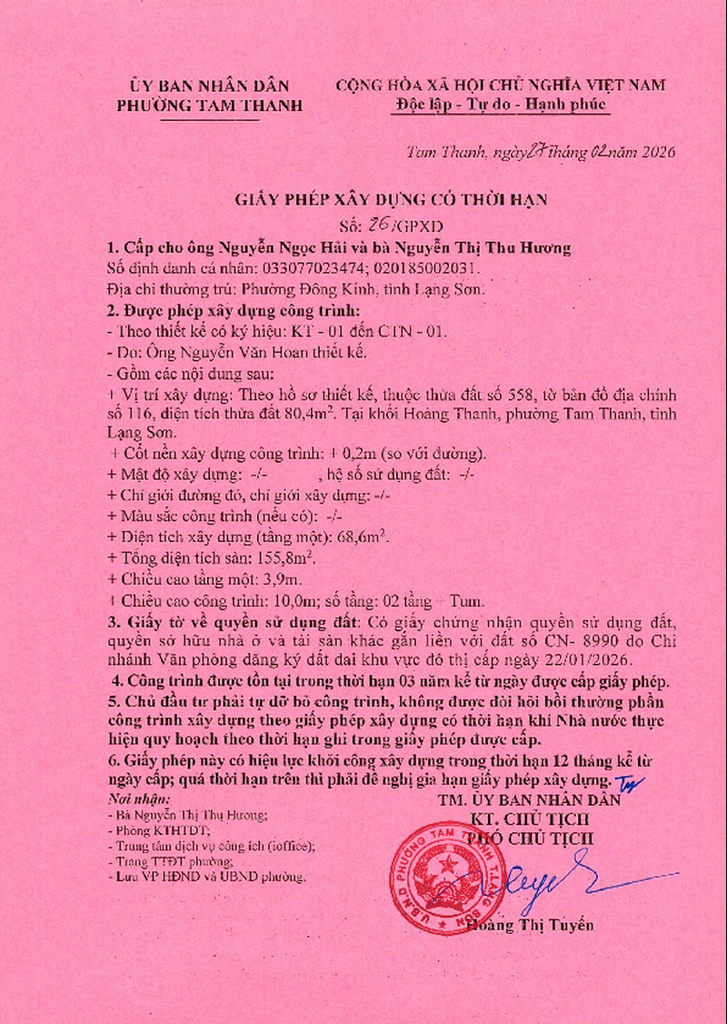 | Tiêu đề văn bản | Giấy phép xây dựng cấp ông Nguyễn Ngọc Hải, bà Nguyễn Thị Thu Hương, phường Đông Kinh, tỉnh Lạng Sơn. Đất tại Khối Hoàng Thanh, phường Tam Thanh, Tỉnh Lạng Sơn | ||