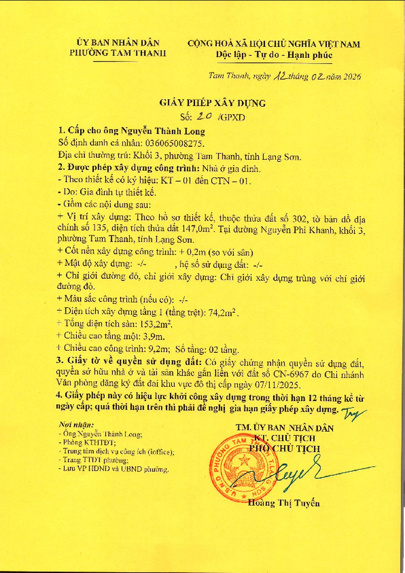 | Tiêu đề văn bản | Giấy phép xây dựng cấp ông Nguyễn Thành Long, khối 3, phường Tam Thanh, tỉnh Lạng Sơn. Đất tại đường Nguyễn Phi Khanh, khối 3, phường Tam Thanh, Tỉnh Lạng Sơn | ||