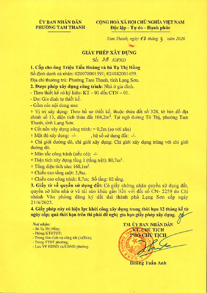 | Tiêu đề văn bản | Giấy phép xây dựng cấp ông Triệu Tiến Hoàng, bà Tạ Thị Hằng phường Tam Thanh, tỉnh Lạng Sơn. Đất tại Ngõ đường Tô Thị, phường Tam Thanh, tỉnh Lạng Sơn | ||
