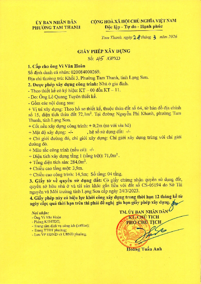 | Tiêu đề văn bản | Giấy phép xây dựng cấp ông Vi Văn Hoàn khối 3, phường Tam Thanh. Đất đường Nguyễn Phi Khanh, phường Tam Thanh, tỉnh Lạng Sơn | ||