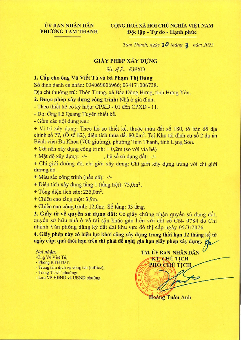 | Tiêu đề văn bản | Giấy phép xây dựng cấp ông Vũ Viết Tú, bà Phạm Thị Đáng, Thôn Trung, xã Bắc Đông Hưng, tỉnh Hưng Yên. Đất tại Khu tái định cư số 2, dự án bệnh viện Đa khoa (700 giường), phường Tam Thanh, tỉnh Lạng Sơn (Thửa 2) | ||
