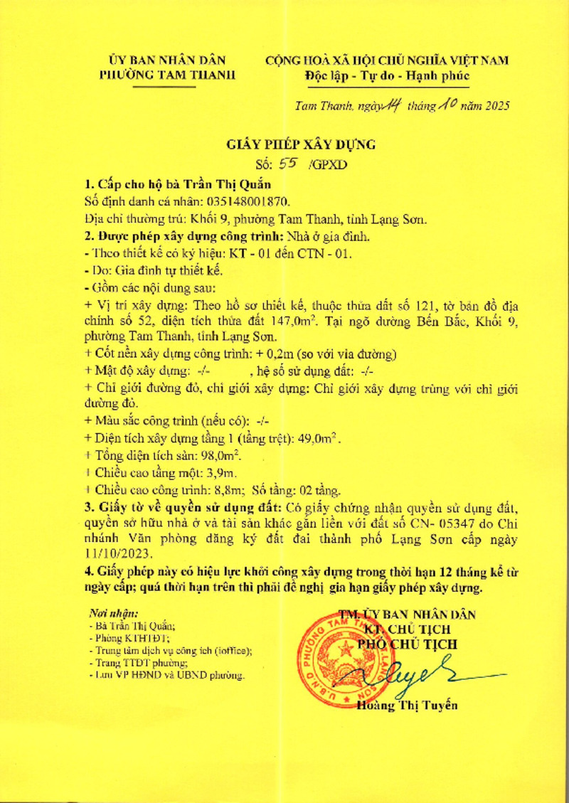 | Tiêu đề văn bản | Giấy phép xây dựng hộ bà Trần Thị Quắn | ||