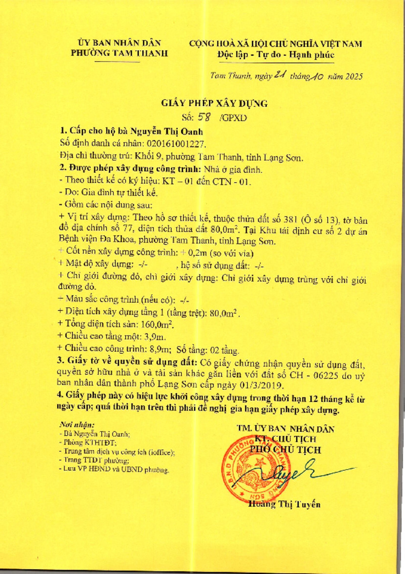 | Tiêu đề văn bản | Giấy phép xây dựng Nguyễn Thị oanh | ||