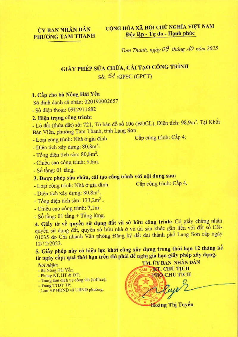 | Tiêu đề văn bản | Giấy phép xây dựng Nông Hải Yến | ||