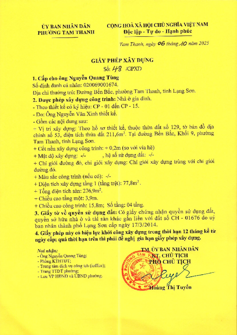 | Tiêu đề văn bản | Giấy phép xây dựng ông Nguyễn Quang Tùng | ||
