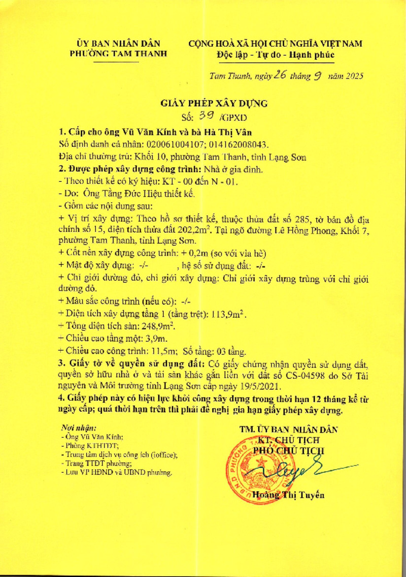 | Tiêu đề văn bản | Giấy phép xây dựng Ông Vũ Văn Kính | ||