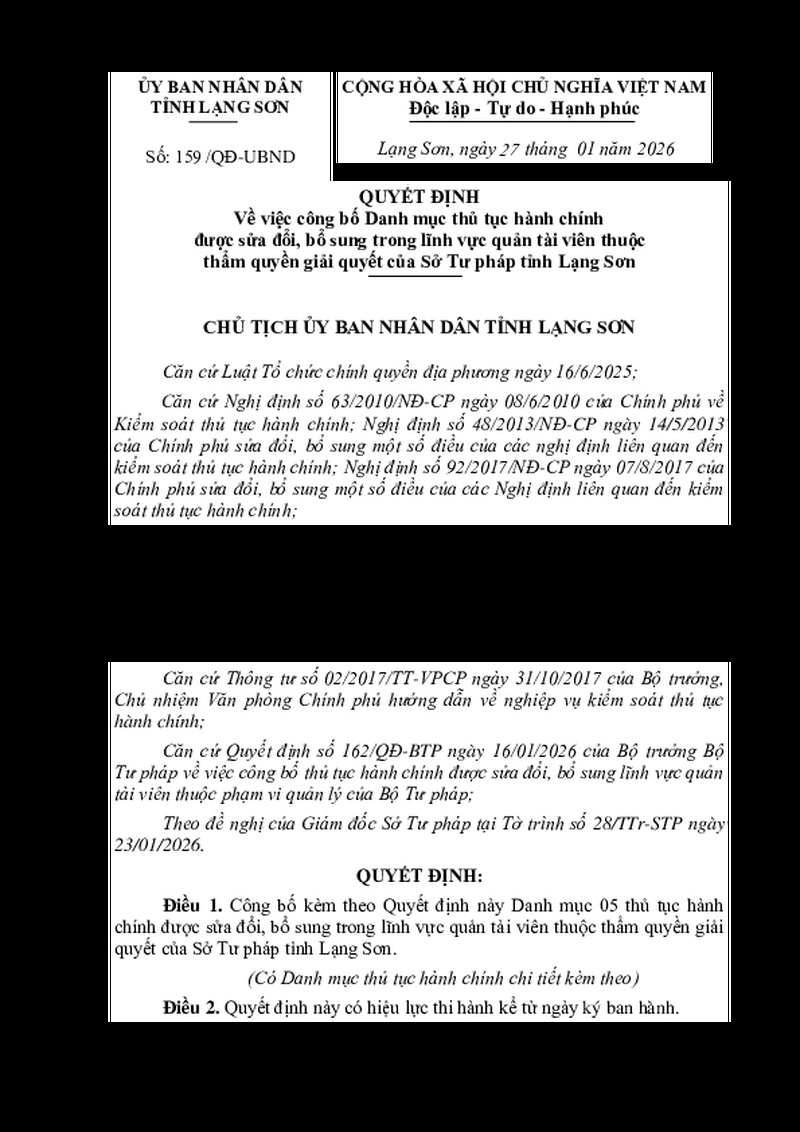 | Tiêu đề văn bản | Về việc công bố Danh mục thủ tục hành chính được sửa đổi, bổ sung trong lĩnh vực quản tài viên thuộc thẩm quyền giải quyết của Sở Tư pháp tỉnh Lạng Sơn | ||