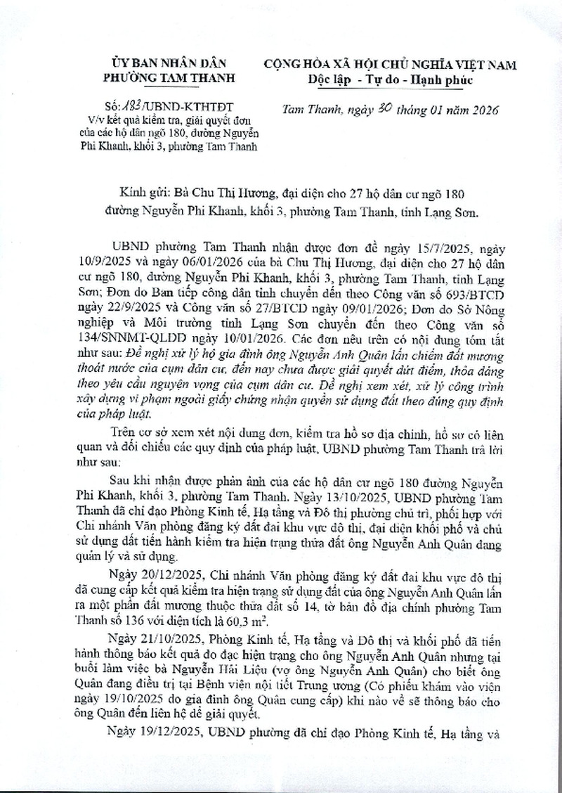 | Tiêu đề văn bản | V/v báo cáo kết quả giải quyết đơn của bà Chu Thị Hương (đại diện cho 27 hộ dân cư ngõ 180 đường Nguyễn Phi Khanh, khối 3, phường Tam Thanh, tỉnh Lạng Sơn) | ||