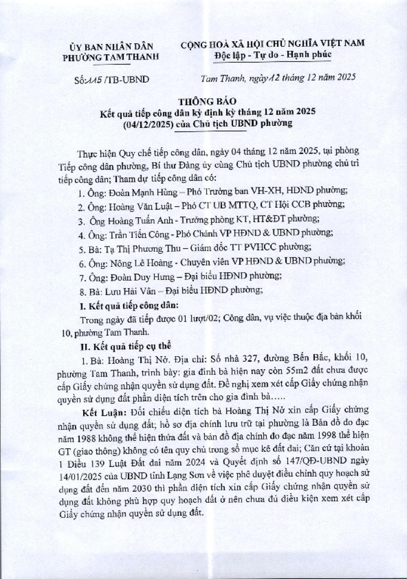 | Tiêu đề văn bản | Thông báo kết quả tiếp công dân định kỳ tháng 12/2025 | ||