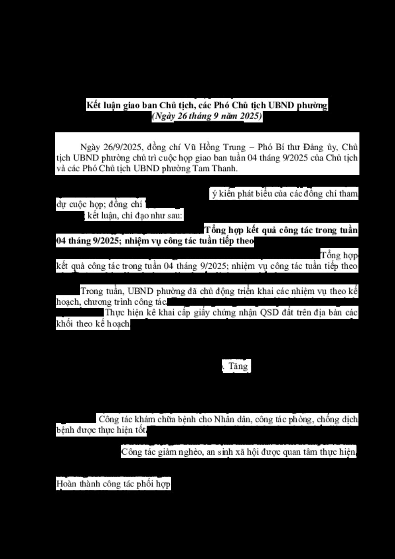 | Tiêu đề văn bản | THÔNG BÁO Kết luận giao ban Chủ tịch, các Phó Chủ tịch UBND phường (Ngày 26 tháng 9 năm 2025) | ||