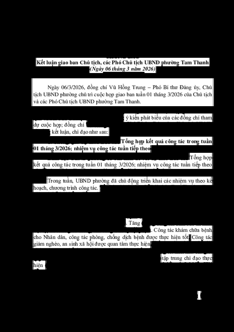 | Tiêu đề văn bản | Thông báo Kết luận giao ban Chủ tịch, các Phó Chủ tịch UBND phường Tam Thanh (Ngày 06 tháng 3 năm 2026) | ||