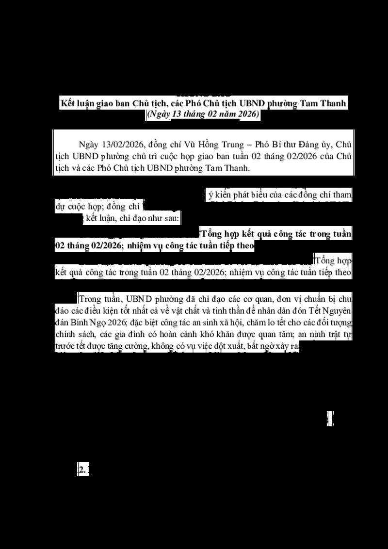 | Tiêu đề văn bản | Thông báo Kết luận giao ban Chủ tịch, các Phó Chủ tịch UBND phường Tam Thanh (Ngày 13 tháng 02 năm 2026) | ||