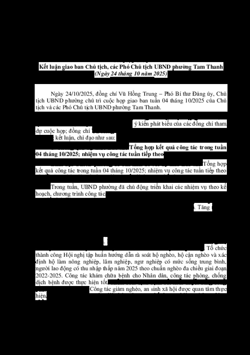| Tiêu đề văn bản | THÔNG BÁO Kết luận giao ban Chủ tịch, các Phó Chủ tịch UBND phường Tam Thanh (Ngà y 24 tháng 10 năm 2025 | ||
