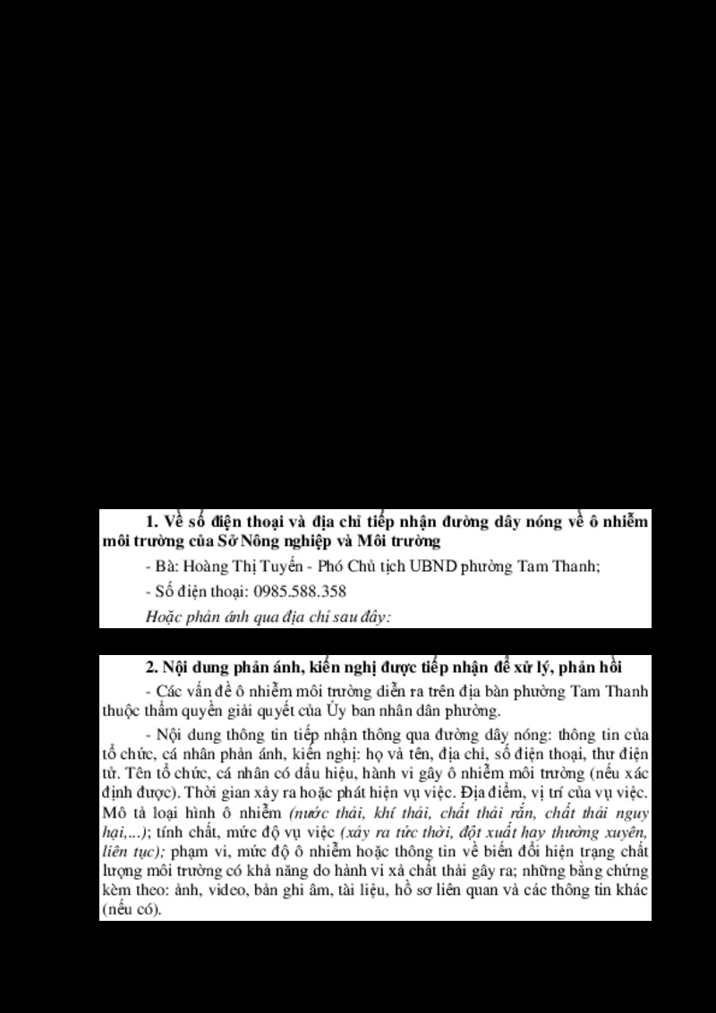 | Tiêu đề văn bản | Thông báo Về việc công khai số điện thoại và thư điện tử tiếp nhận, xử lý thông tin đường dây nóng về ô nhiễm môi trường trên địa bàn phường Tam Thanh | ||