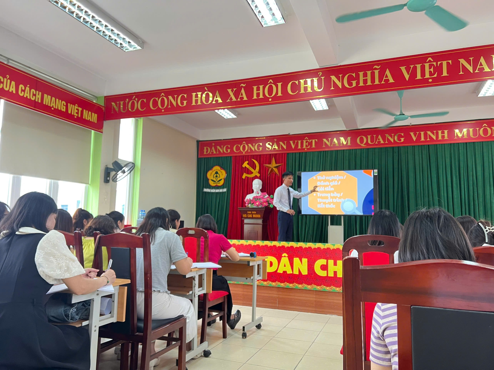 Trong hai ngày 24 – 25/9/2025, Trường Mầm non Hoa Sữa phối hợp với MN 8/3, MN 19/5 và MN Hoa Hồng tổ chức khóa đào tạo “Giáo dục STEAM: Triết lý, Thực hành và Ứng dụng” do thầy Nguyễn Văn Phúc – chuyên gia STEAM trực tiếp giảng dạy. Với các nội dung “Hiểu rõ bản chất giáo dục STEAM, cách áp dụng ở 4 độ tuổi; thực hành chọn đề tài, thiết kế giáo án 5E và báo cáo thuyết trình. Tiếp cận giáo án EDP; xây dựng kế hoạch dự án STEAM, trang trí môi trường học tập trong và ngoài lớp; tổng kết và cấp chứng nhận STEAM”