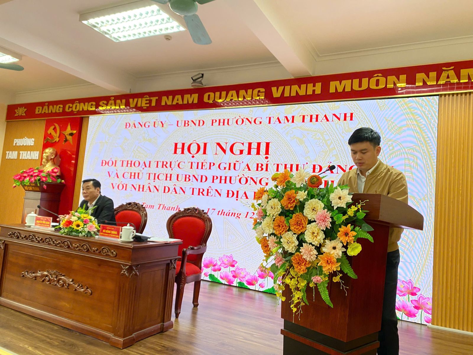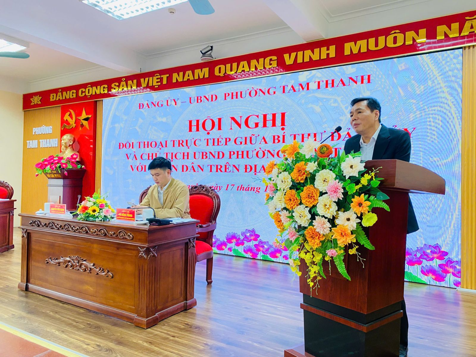 Thực hiện Kế hoạch số 12-KH/ĐU ngày 22/10/2025 của Ban Thường vụ Đảng ủy phường Tam Thanh về tổ chức hội nghị đối thoại trực tiếp giữa người đứng đầu cấp ủy, chính quyền với nhân dân trên địa bàn phường Tam Thanh năm 2025. Ngày 17/12/2025, Đảng ủy - UBND phường tổ chức Hội nghị đối thoại trực tiếp giữa Bí thư Đảng ủy và Chủ tịch UBND phường với nhân dân trên địa bàn năm 2025.