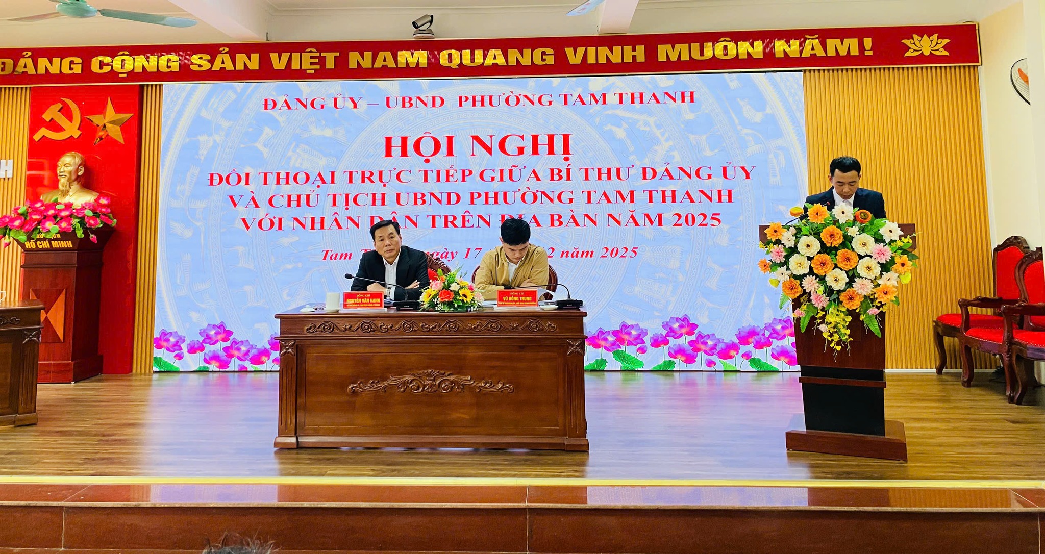 Thực hiện Kế hoạch số 12-KH/ĐU ngày 22/10/2025 của Ban Thường vụ Đảng ủy phường Tam Thanh về tổ chức hội nghị đối thoại trực tiếp giữa người đứng đầu cấp ủy, chính quyền với nhân dân trên địa bàn phường Tam Thanh năm 2025. Ngày 17/12/2025, Đảng ủy - UBND phường tổ chức Hội nghị đối thoại trực tiếp giữa Bí thư Đảng ủy và Chủ tịch UBND phường với nhân dân trên địa bàn năm 2025.