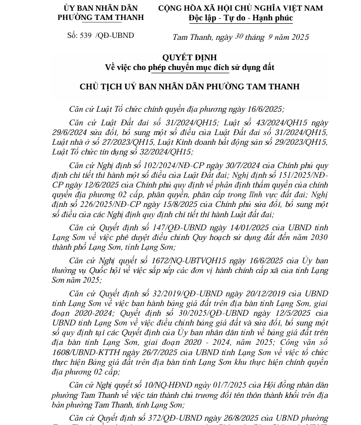 QUYẾT ĐỊNH Về việc cho phép chuyển mục đích sử dụng đất ông Lê Minh Lộc, trú tại khối 8, phường Tam Thanh
